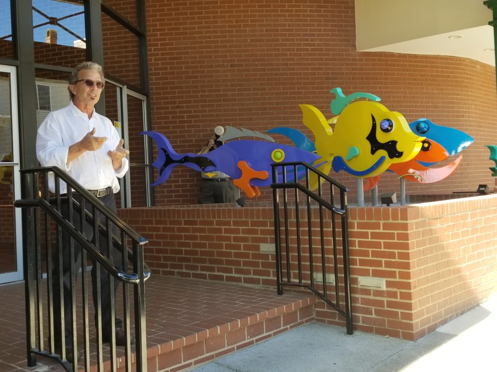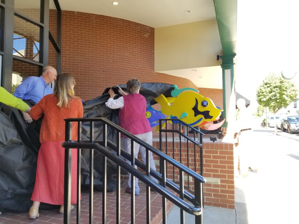 Bob Poff gave his opening remarks to a crowd of excited faces to begin the ceremony. Then, the three couples and Wertz gathered around the sculptures to reveal the Happy Fish. Once the fish were unveiled, Dave, the artist, shared the joy he felt while working on the project. Even the Mayor of Christiansburg, Mike Barber, spoke about his plans for the future of downtown. This collaborative effort represents a step towards supporting the Town of Christiansburg’s vision for a more engaging experience.